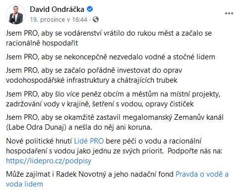Pan Ondráčka v roce 2020 odešel z TI a vstoupil do politiky. Nyní se veřejně k vodě vyjadřuje stejně razantně a ve stejném gardu jako já od roku 2002.