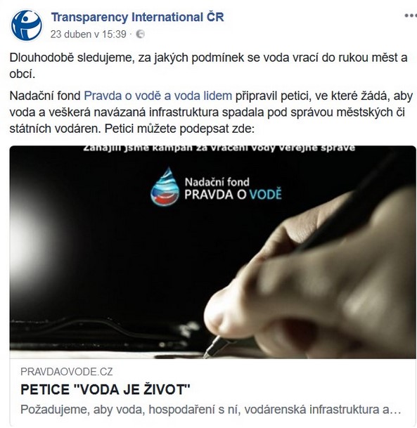 TI jako jediná z protikorupčních fondů sem tam informovala o tom, co děláme, jak bráníme vodu a jaké dosahujeme rozsudky. Pro srovnání Nadační fond proti korupci – za 10 let o vodě zveřejnil jediný příspěvek ZDE.