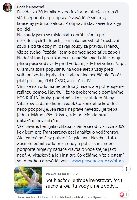 V minulosti jsem požádal několikrát protikorupční organizace o pomoc, ale žádná se do obrany vody nepustila a ani nám nepomohla ani když jsme jim předali důkazy a rozsudky, jejichž dosažení trvalo 15-17 let. Jediný, kdo trochu pomohl (např. informoval lidi o naší petici VODA JE ŽIVOT, sem tam zveřejnil náš článek či rozsudek o vodě a podal s námi trestní oznámení) je Transparency a v jejím vedení stojící David Ondráčka.